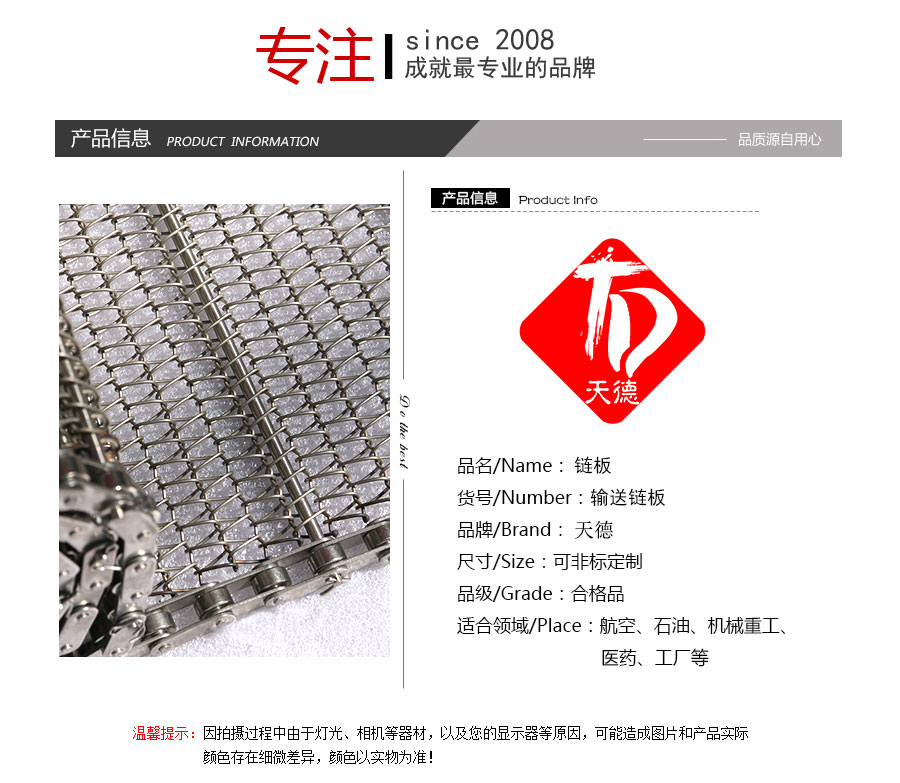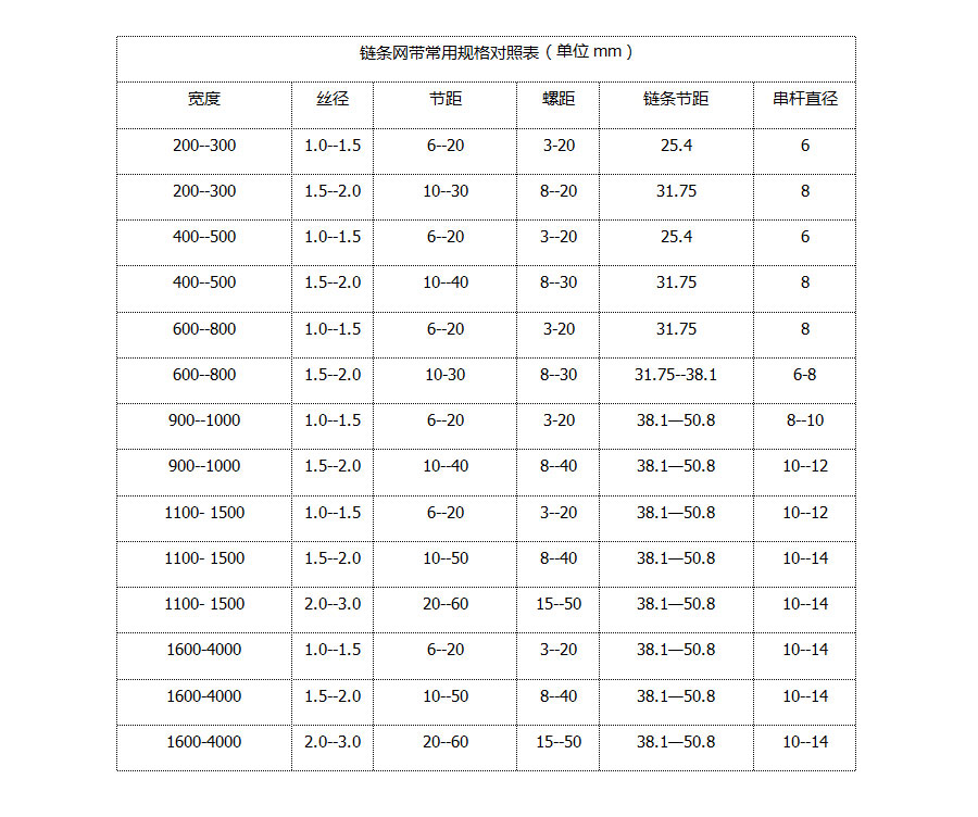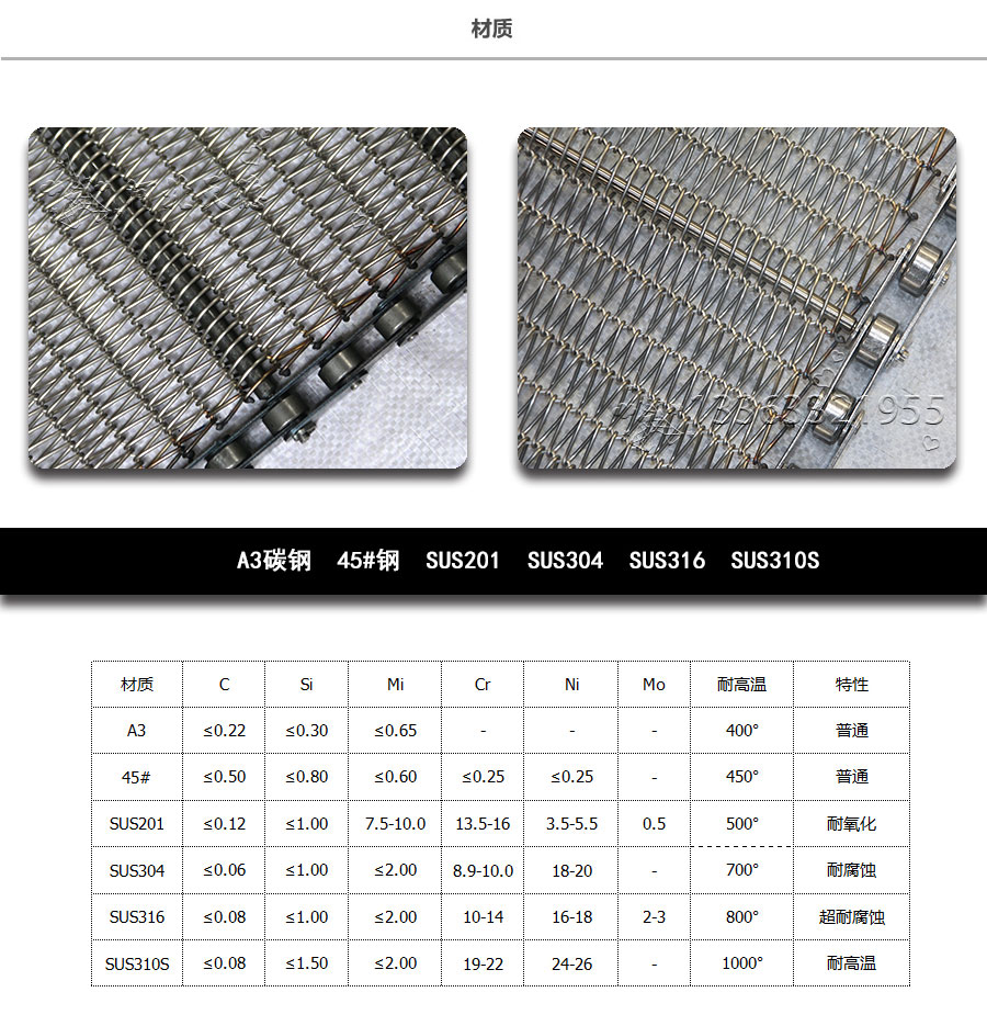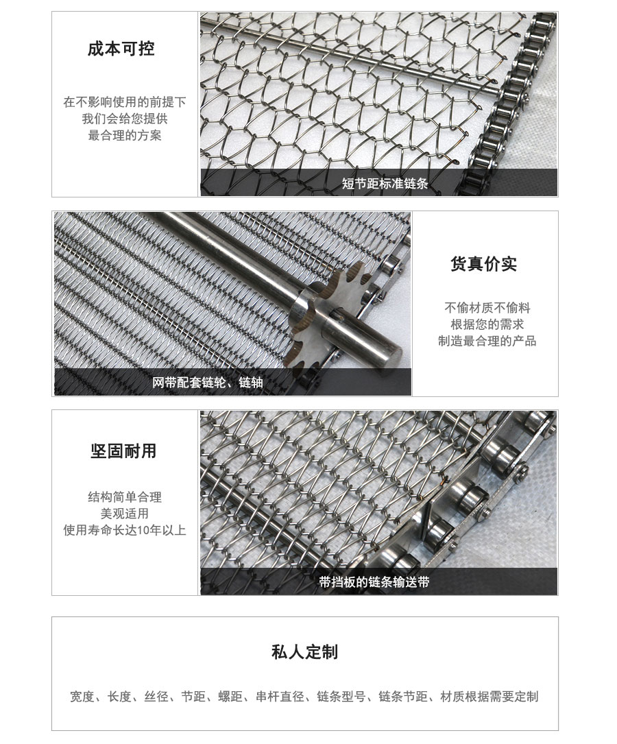 廣泛用于玻璃制品行業的退火爐網帶、烤花爐網帶等。食品加工行業、脫水蔬菜、速凍食品單凍機前處理網帶、鏈網。粉末冶金、金屬熱處理、淬火、燒結、釬焊、焙燒、光亮、發黑、軸承、滲碳高溫爐網帶、擋板式網帶、涂裝烘干線輸送網帶、泡沫鎳還原生產線網帶,清洗機、提升機、干燥機、烘干機、固化爐網帶。
