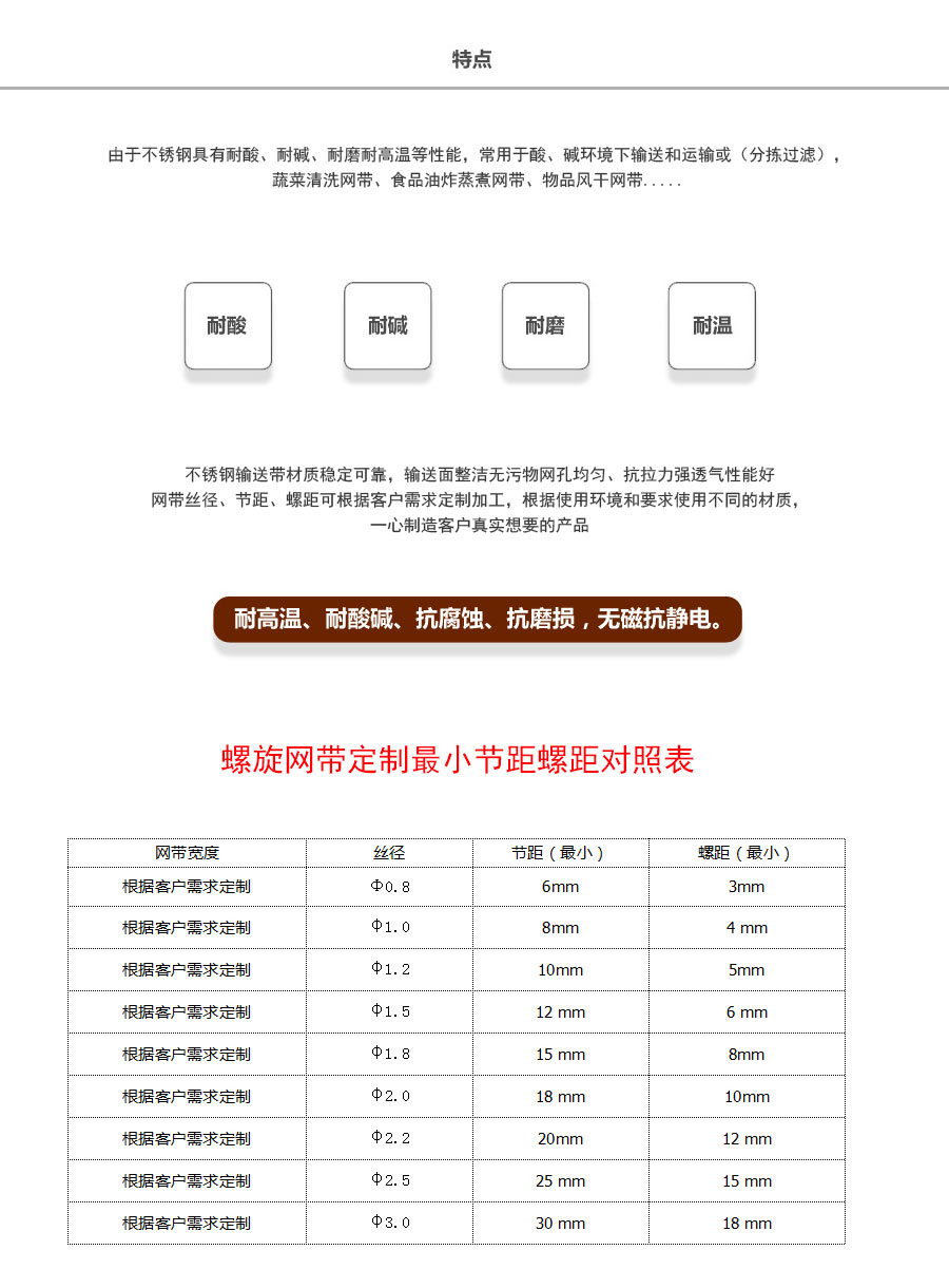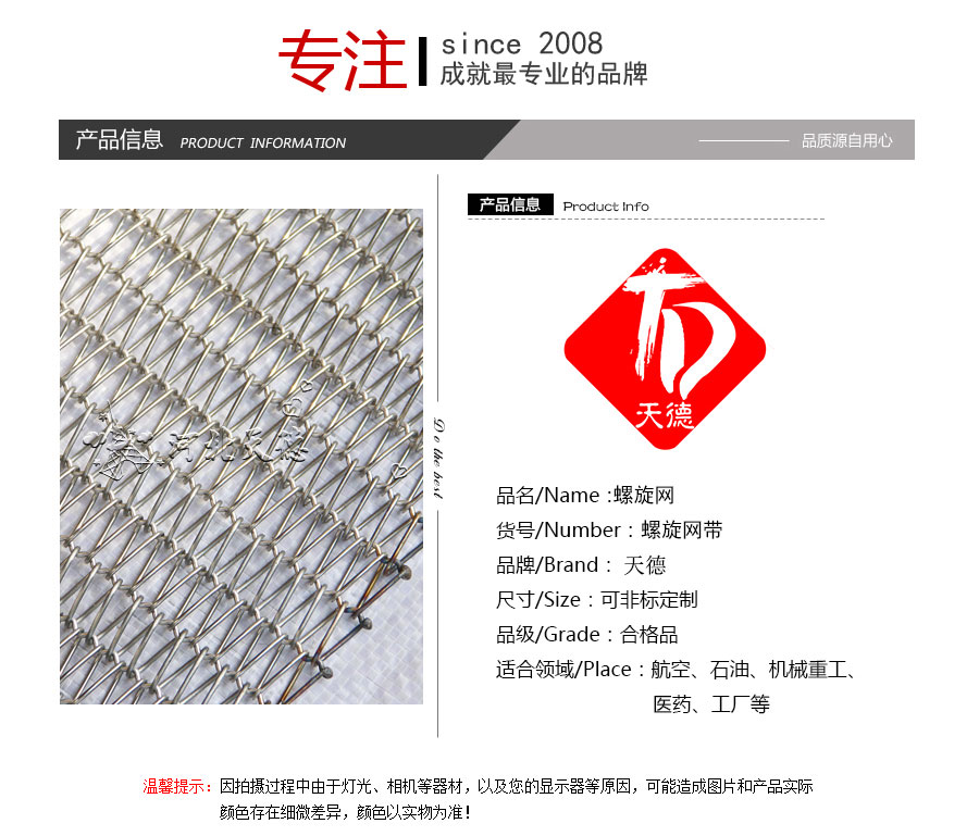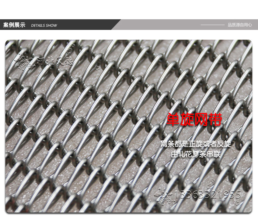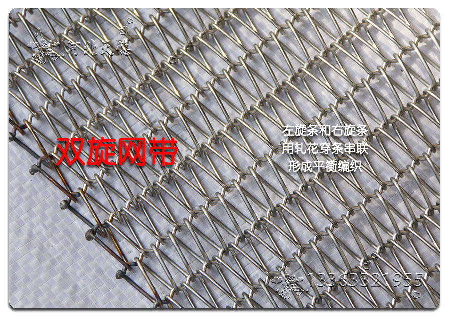 雙旋不銹鋼網帶屬于非標準件,我們將根據(jù)你提供的規(guī)格長寬,材質,不銹鋼絲線徑,編制結構尺寸,支軸直徑,支軸間距,鏈條型號等數(shù)據(jù)制作.