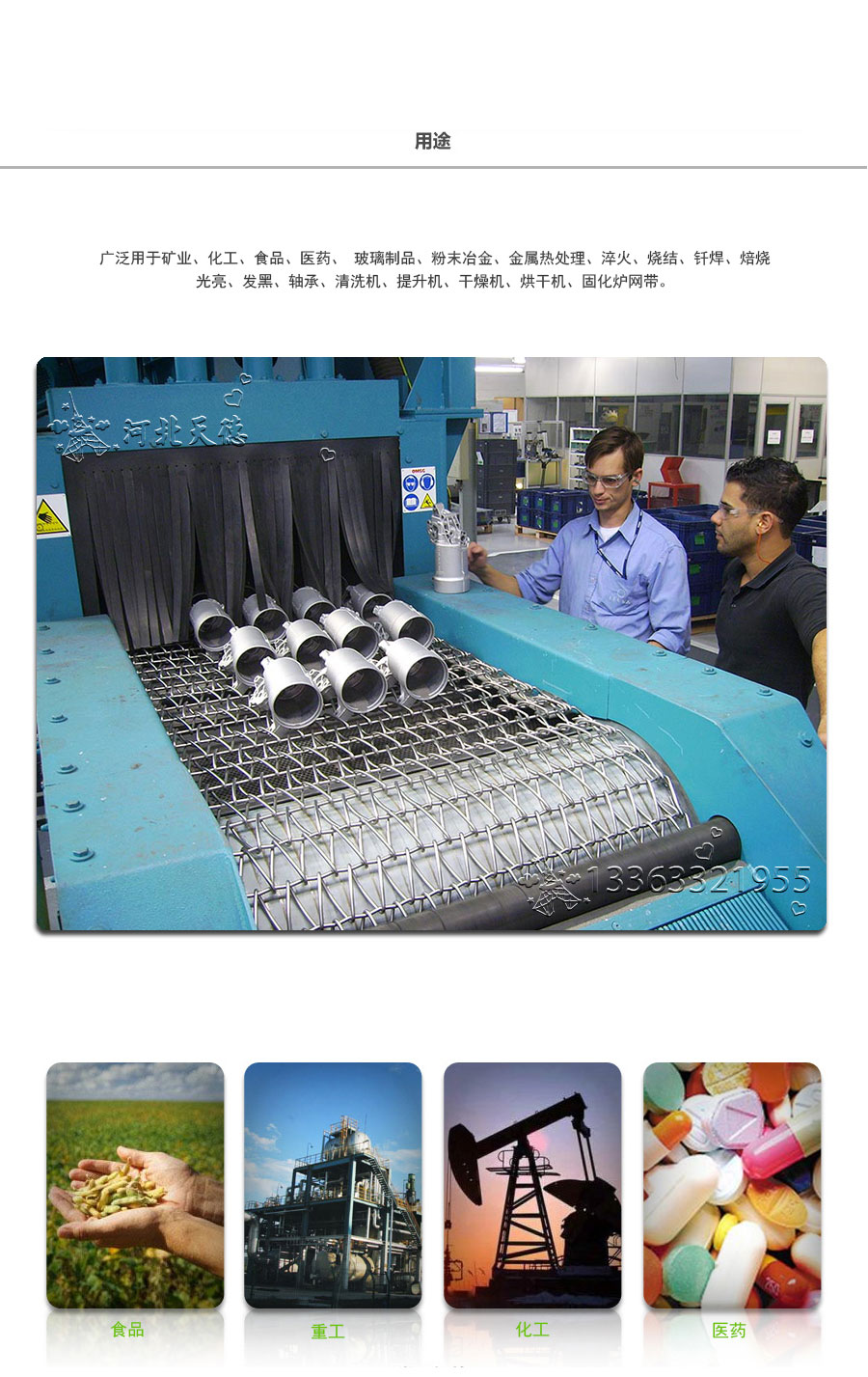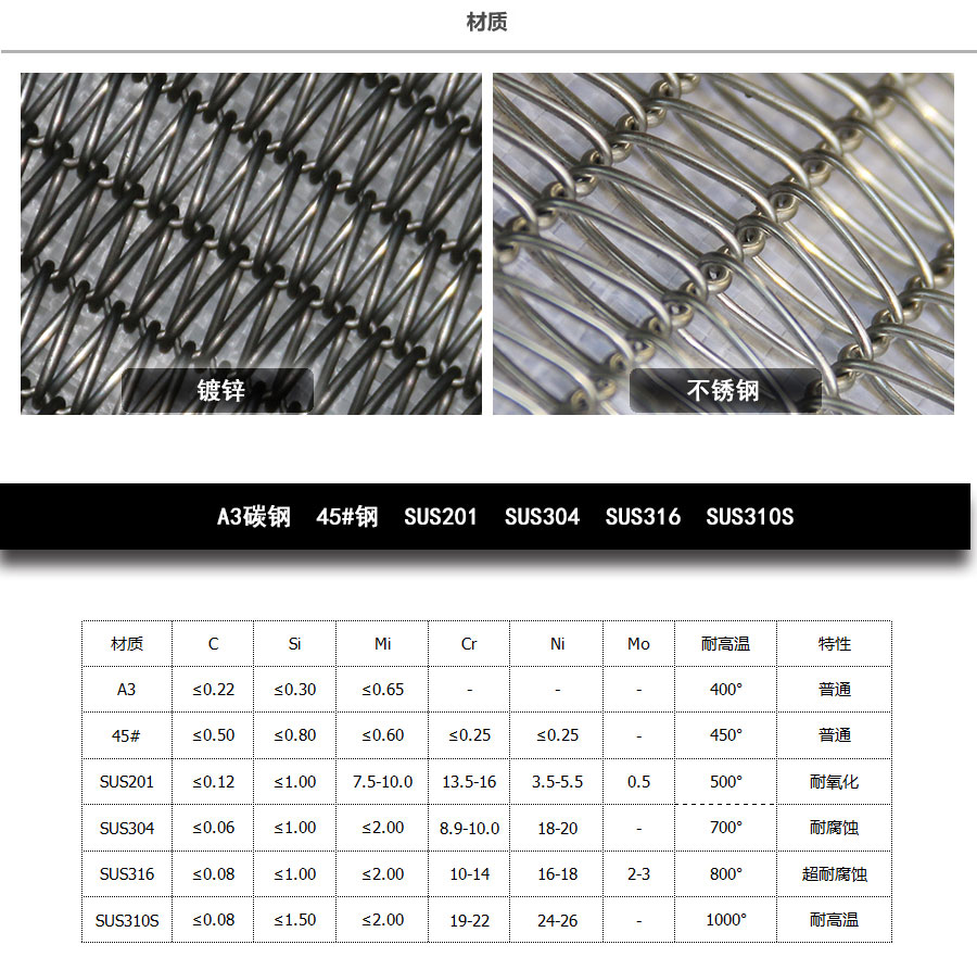 雙旋輸送帶:由左右交替的網條通過軋花串條聯(lián)結而成,集中了金屬絲編織網帶的各種優(yōu)點,由于具有彎曲較深的串條,使各個螺旋盤條的位置取得正確的定位,因此可以減少網帶的變型和延伸。 雙旋輸送帶材質:不銹鋼201、不銹鋼304、不銹鋼316、不銹鋼316L、普通鋼絲、普通鐵絲、耐高溫不銹鋼、耐酸不銹鋼 雙旋輸送帶用途:廣泛用于石油、冶金、食品加工機械、制藥、玻璃、印制線路板等輸送設備。